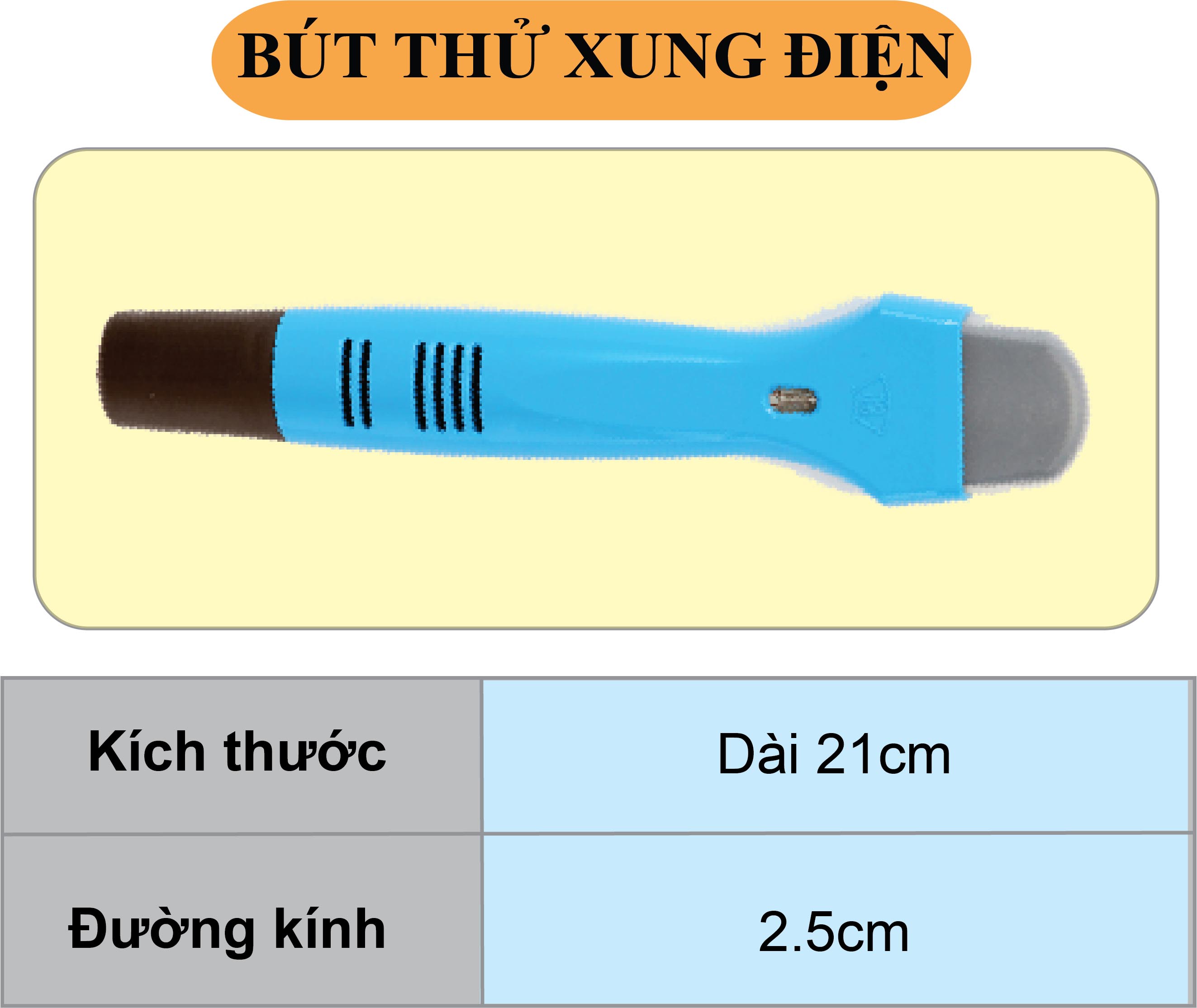 - Bút thử xung điện sử dụng khi kiểm tra xung điện trên cơ thể người khi trị liệu. Bút có tính năng đặt biệt không sử dụng pin. Khi có nguồn điện sinh thể vào cơ thể người đèn sẽ phát sáng khi thử. Ngược lại thì không.