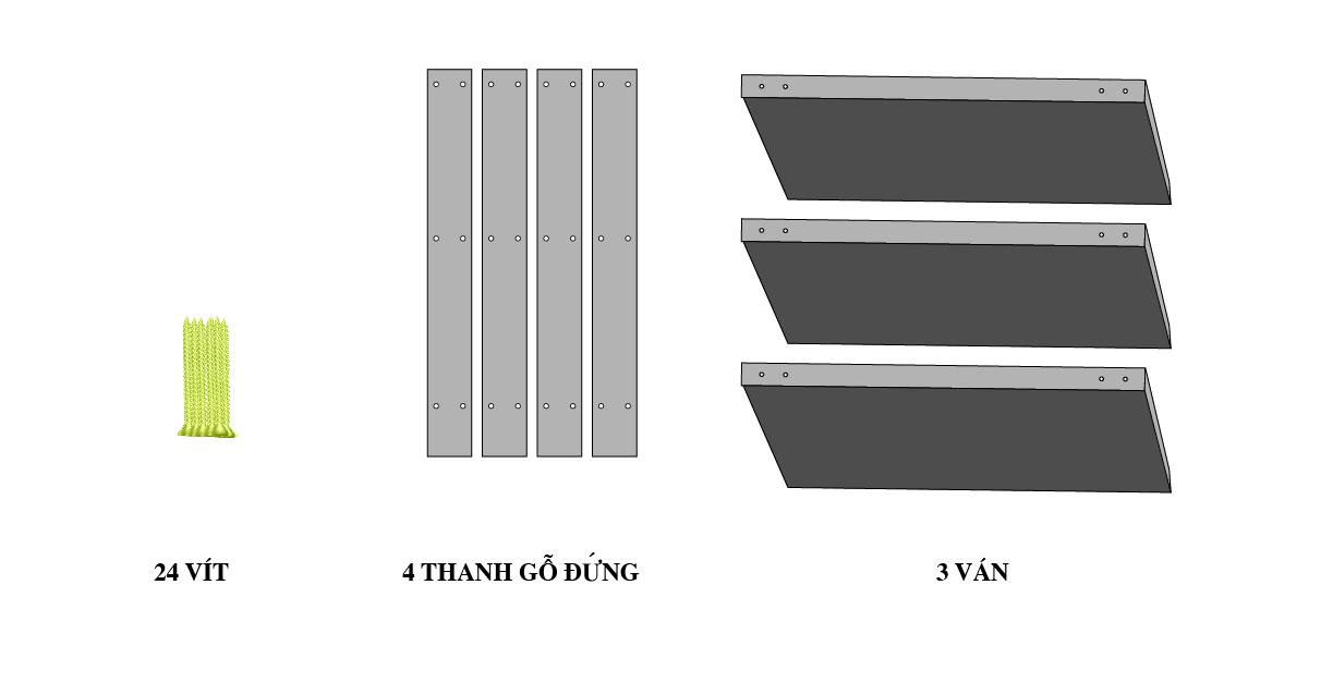 gồm 4 thanh gỗ đứng, 3 tấm gỗ và 24 con vít.Lắp ráp :